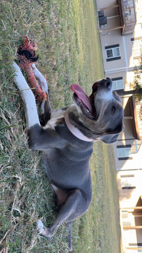 Pet Description:Koa is a medium sized dog with a gray coat and white paws. She has some brown on her as well. She is super friendly! |