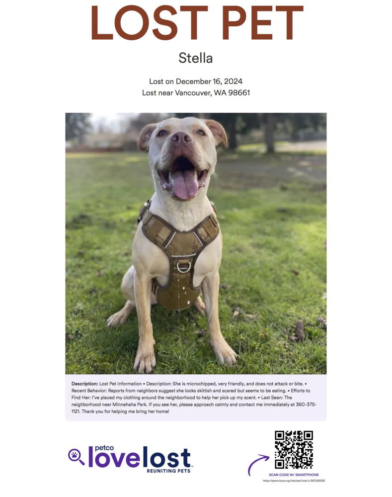Pet Description:Stella is missing, and I need your help to bring her home. • Description: She is microchipped, very friendly, and does not attack or bite. • Recent Behavior: Neighbors have reported seeing her looking skittish and scared, but she seems to be eating. • Last Seen: Near Minnehaha Park in the surrounding neighborhood.Please approach or follow her calmly if you see her and contact me immediately at:360-375-112oneThank you so much for any help you can provide!This layout is formatted to be clear and e |