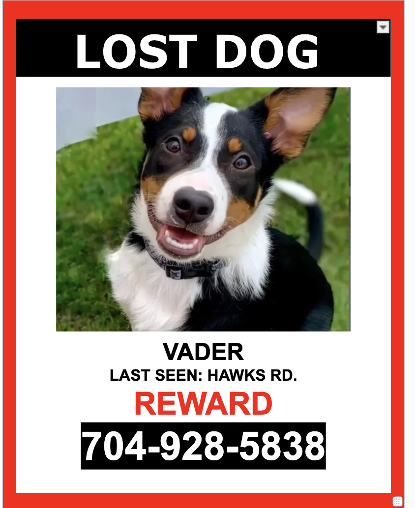 Pet Description:**MISSING SINCE 12/22/2024 AT 06:45 PM**VADER is a MALE, BLACK/WHITE/BROWN SHEPHERD MIX who escaped and was last seen near HAWKS ROAD IN STATESVILLE, NC.VADER s wearing HIS COLLAR with a BANDANA and IS microchipped.If you see VADER please DO NOT CHASE HIM.PLEASE CALL OR TEXT ONLY.704-928-5838$$ Reward $$ |