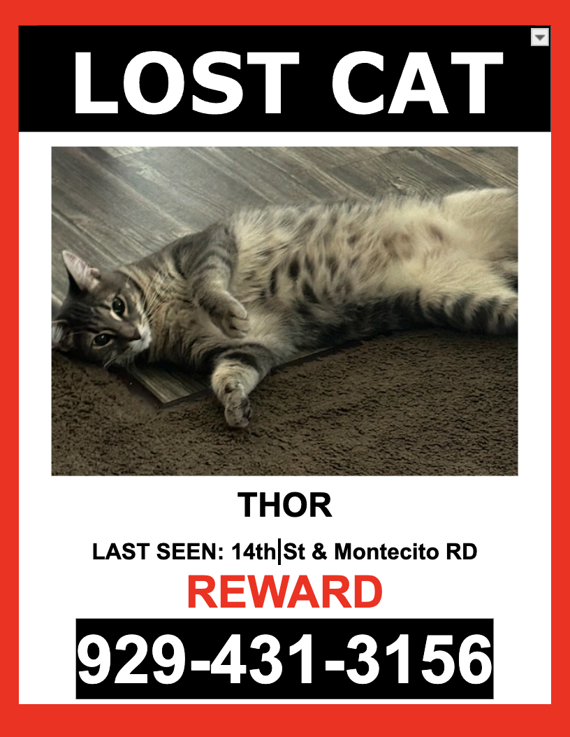 Pet Description:LOST PET - GRAY & WHITE / AMERICAN SHORTHAIR / MALE - $$ Reward $$**MISSING SINCE 12/24/2024 AT 8:00 PM**THOR is a MALE, GRAY & WHITE, AMERICAN SHORTHAIR who escaped and was last seen near 14th St & Montecito RD.THOR is wearing NOT WEARING HIS COLLAR with tags and IS NOT microchipped.If you see THOR please DO NOT CHASE HIM.PLEASE CALL OR TEXT ONLY.929-431-3156$$ Reward $$ |