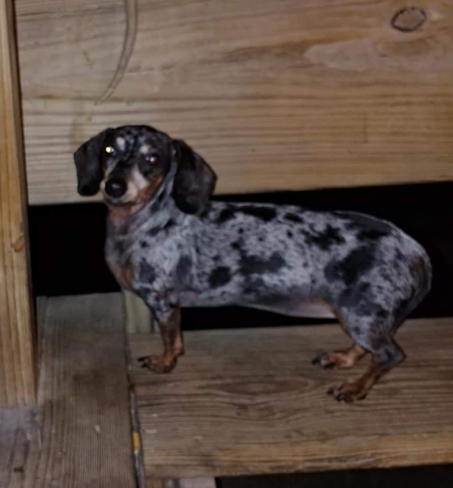 Pet Description:She is microchipped, spayed, and is a dapple miniature dachshund. She is on seizure medication and needs it! She is approximately 14 years old |