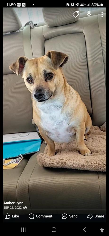 Pet Description:Looks like a chiweenie mix. About 22 lbs. Chunky. Very big chest on little dog. Little legs. Hes brown with a white chest |