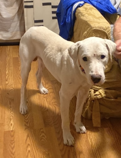 Pet Description:He’s a big white dog tan spots has an orange collar on . Dark brown eyes has his tail dock he’s neutered and microchipped. |