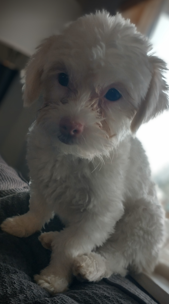 Pet Description:White dog, pink snout with a tiny beauty mark on the tip. Left leg has a limp and she runs on three legs. |