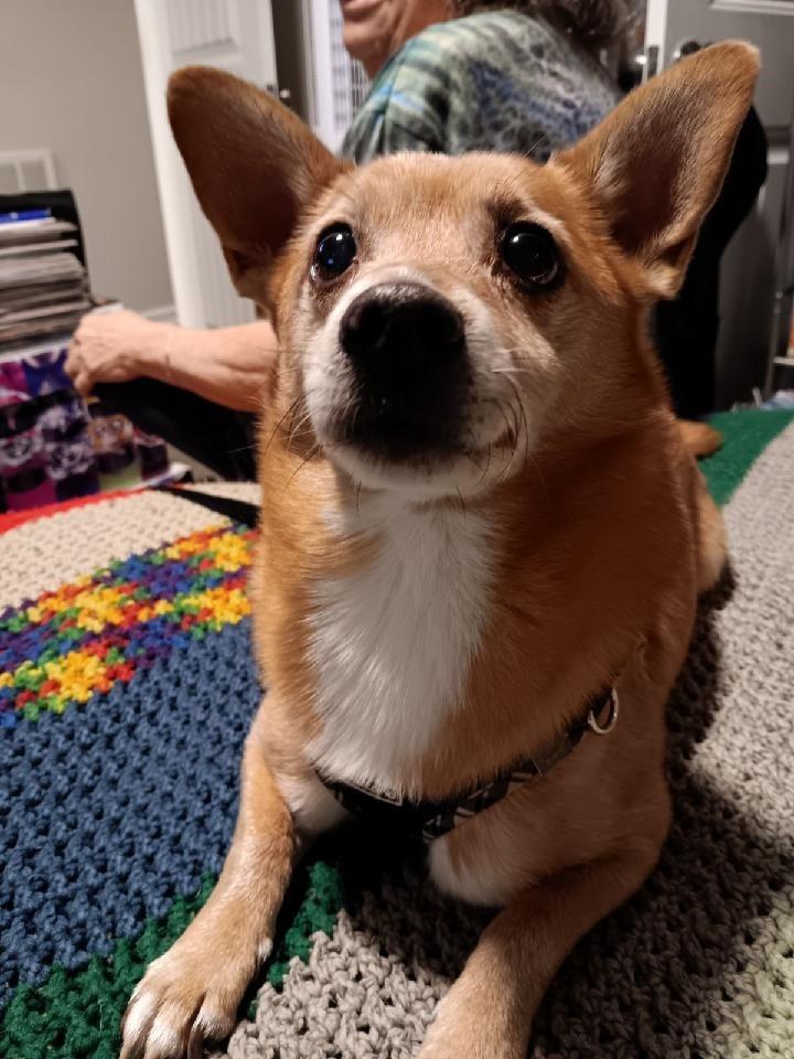 Pet Description:Wearing harness with blue checkered pattern with a wire leash. |