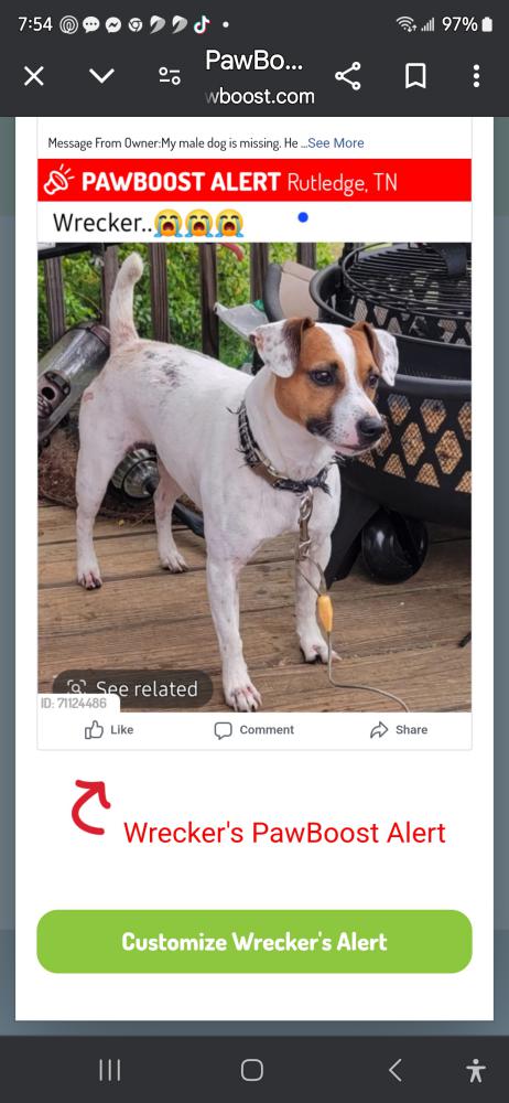 Pet Description:Wrecker is a Parsons jack russell, long legs and tall. He is very friendly. He ran out of my front door late 12/17. |
