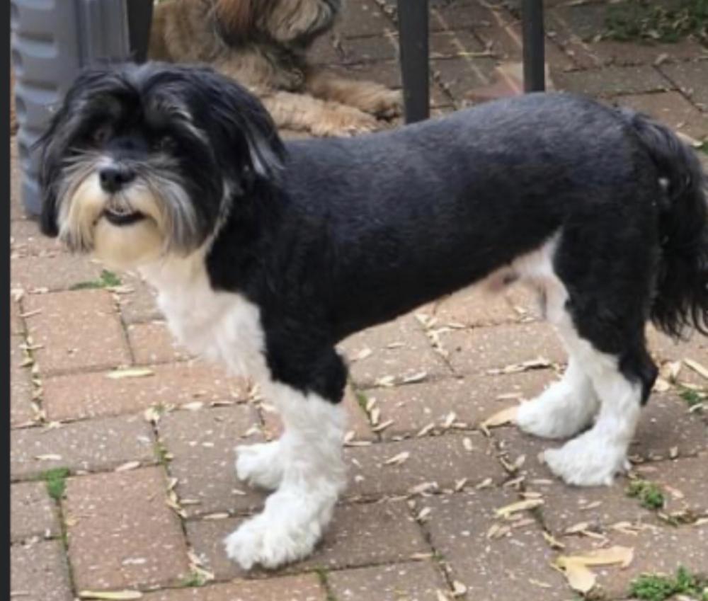 Pet Description:Male, Neutered Lhasa Apso Black and White. White Legs. Chipped |
