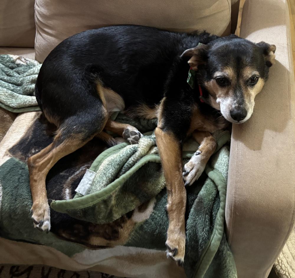 Pet Description:Billie is a beagle mix, about 30 pounds, medium sized, wearing a collar with a Christmas bow tie. |