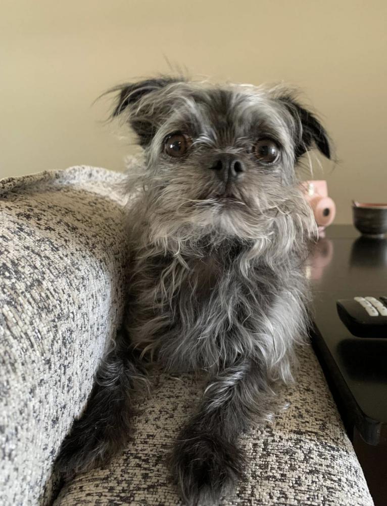 Pet Description:Scruffy black and grey dog with a black spikey collar on. Has a phone number on the collar |
