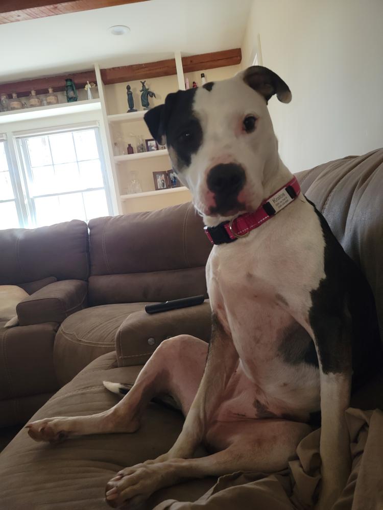 Pet Description:Krados is a very friendly black and white pit bull. She is a family dog & we miss her very much. She also goes by Moo if you call for her. |