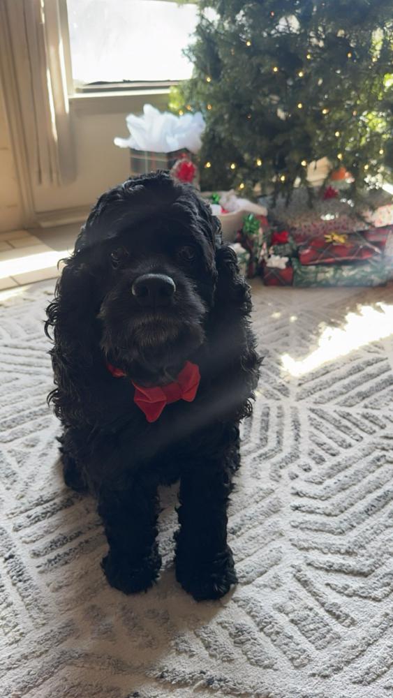 Pet Description:Black cocker spaniel, with a white spot on his neck wearing a red bow tied collar |