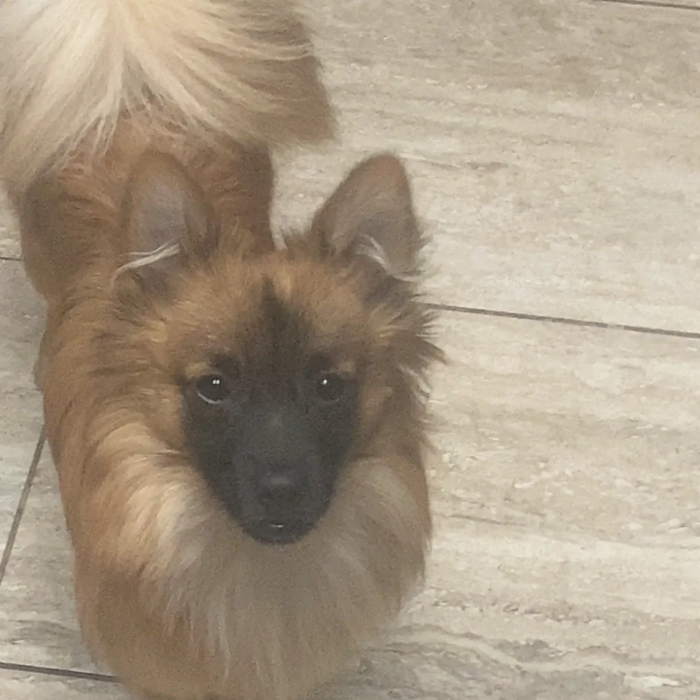 Pet Description:he has a white curly strands coming out his ears his tail is fluffed out curl up on his back |