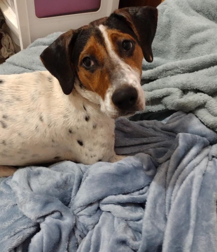 Pet Description:Diamond is white with black spots and some brown on her face and brown spots on her legs. She's wearing a pink collar. |