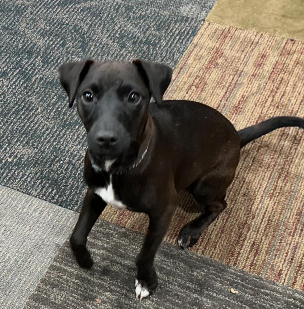 Pet Description:Small All black dog with white on chest and toes, Small 6 month old puppy under 25 pounds |
