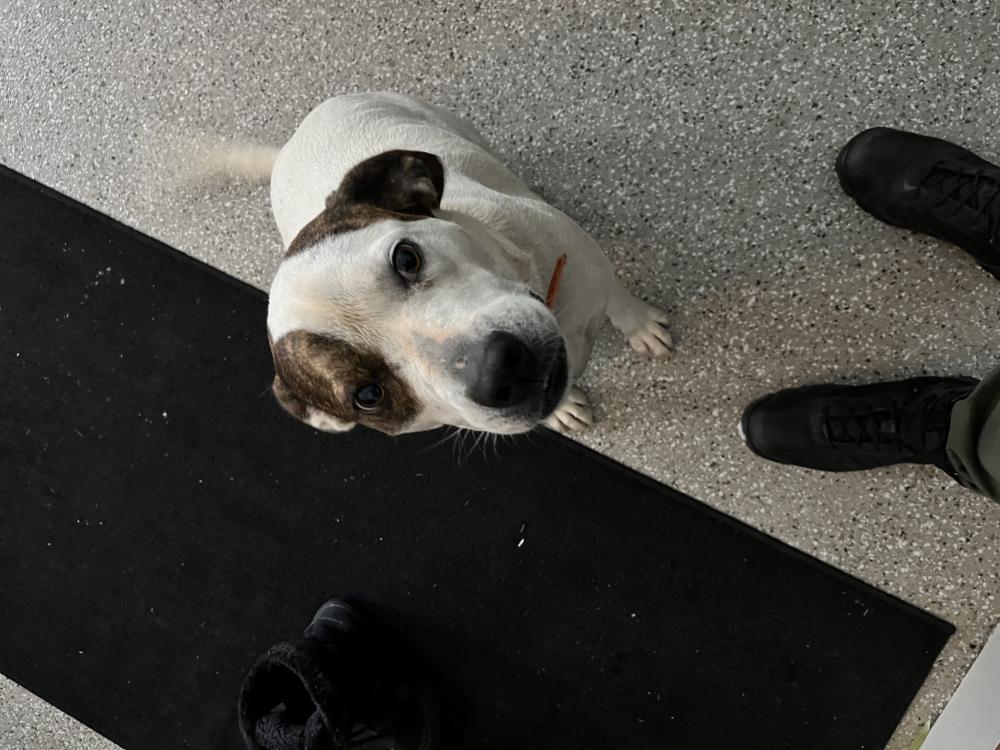 Pet Description:Male, short white hair with brown ears and an orange collar, no tags. |