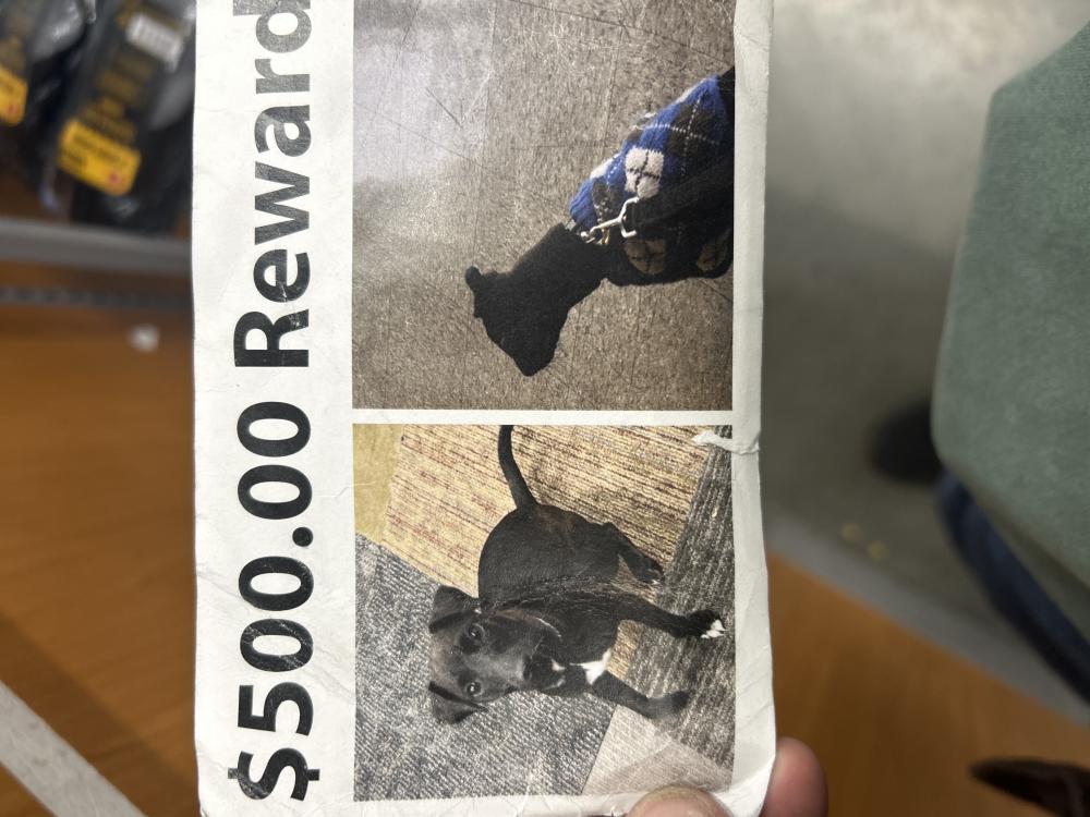 Pet Description:Black coat with white spotted chest was wearing a blue sweater |