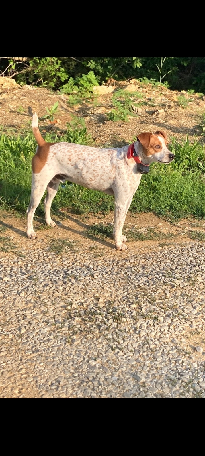 Pet Description:Mountain Feist white with brownish red spots. He is wearing a red PetSafe collar. |