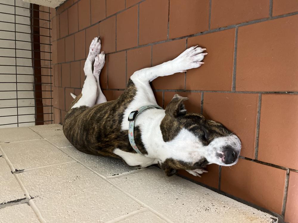 Pet Description:Amora is a sweet but nervous girl so she will walk up to you but may take some time, also very food motivated. She has a white underbelly and her back is brindle, she also has scar tissue on her paws from her previous living situation. She is wearing an aquamarine colored collar with cupcakes on it, the collar has her rabies tag and an Atlanta Humane Society tag on it. |