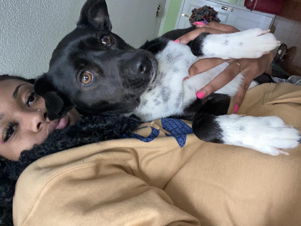 Pet Description:She is a mostly black dog with white on her chest with black spots. She is a bit fat so she has a fat pad on her chest as well |