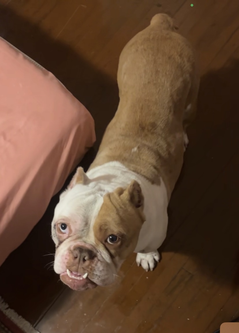 Pet Description:Mix of bulldog and American bully? Wait and brown spots, heterochromia |