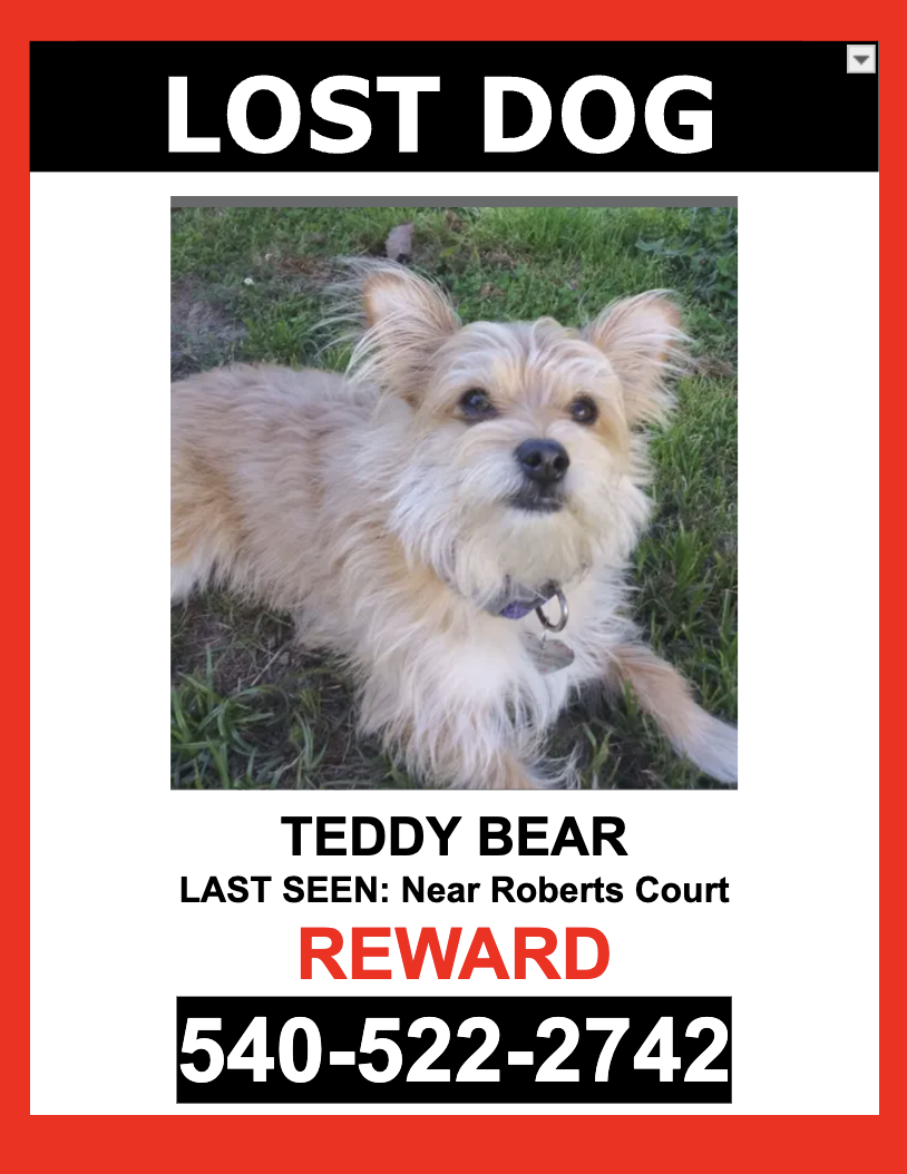 Pet Description:**MISSING SINCE 01/23/25 AT 10:00 PM**TEDDY BEAR is a MALE/ BEIGE/ WIRE HAIR/ MIX BREED who escaped and was last seen near ROBERTS COURT.TEDDY BEAR is wearing HIS COLLAR with tags and IS microchipped.If you see TEDDY BEAR please DO NOT CHASE HIM.PLEASE CALL OR TEXT ONLY.540-522-2742$$ Reward $$ |