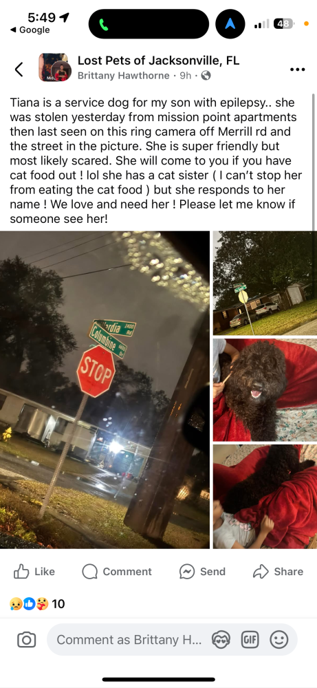 Pet Description:Tiana is a black poodle with a red mark on her back she is a service dog for my son with epilepsy.. she was stolen yesterday from mission point apartments then last seen on this ring camera off Merrill rd and the street in the picture. She is super friendly but most likely scared. She will come to you if you have cat food out ! lol she has a cat sister (I can't stop her from eating the cat food ) but she responds to her name! We love and need her ! Please let me know if someone see her! |