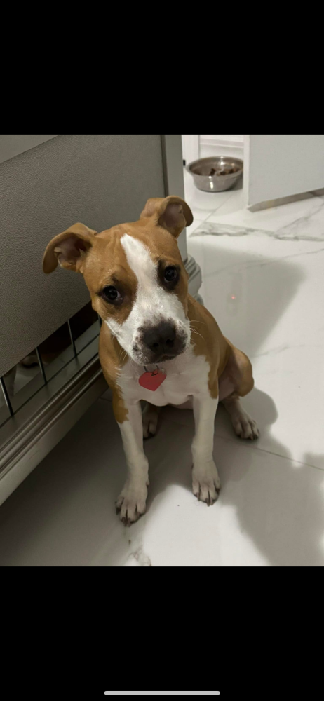 Pet Description:she is a pit bull puppy, she is orange and white with a pink collar and white collar |