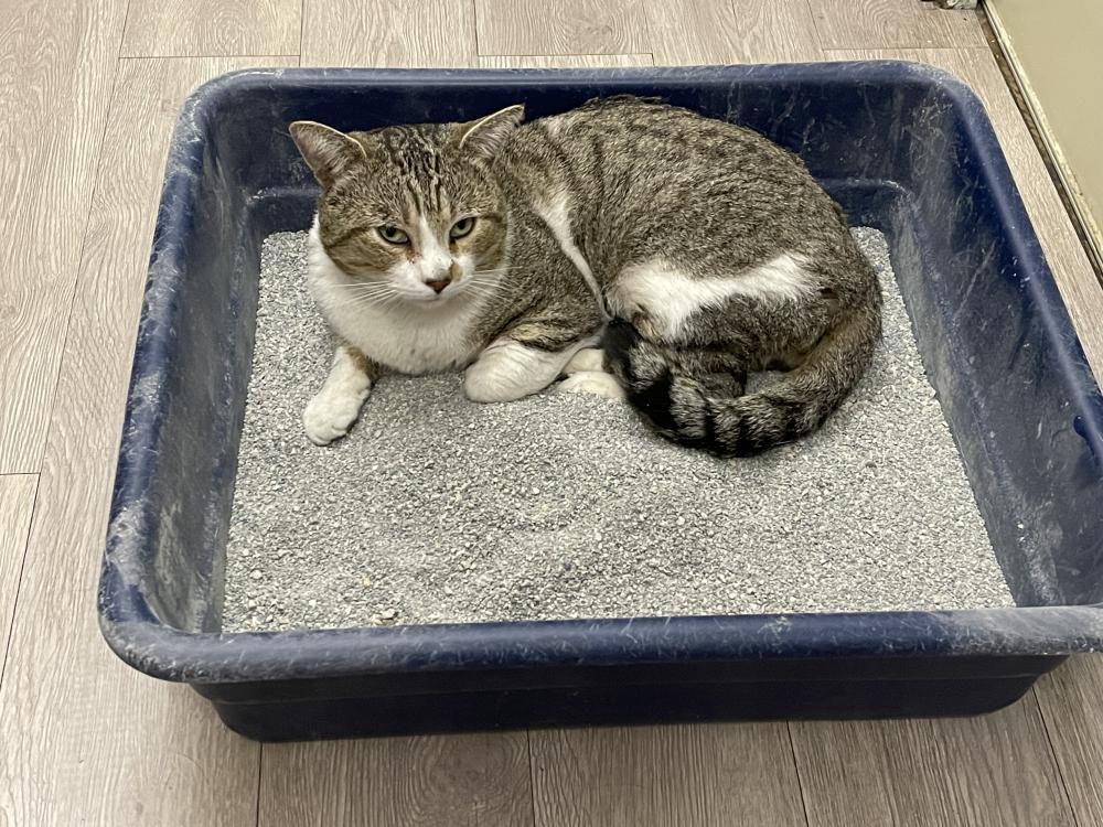 Pet Description:Grey and white small Tabby male cat. Very shy but friendly. |