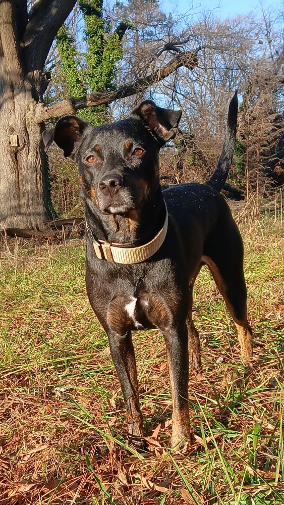 Pet Description:A black/brown mutt with short hair, brown eyes, floppy ears, a thin tail and a weight of 50 pounds. Missing his collar and has a distinct white patch on hus chest. |
