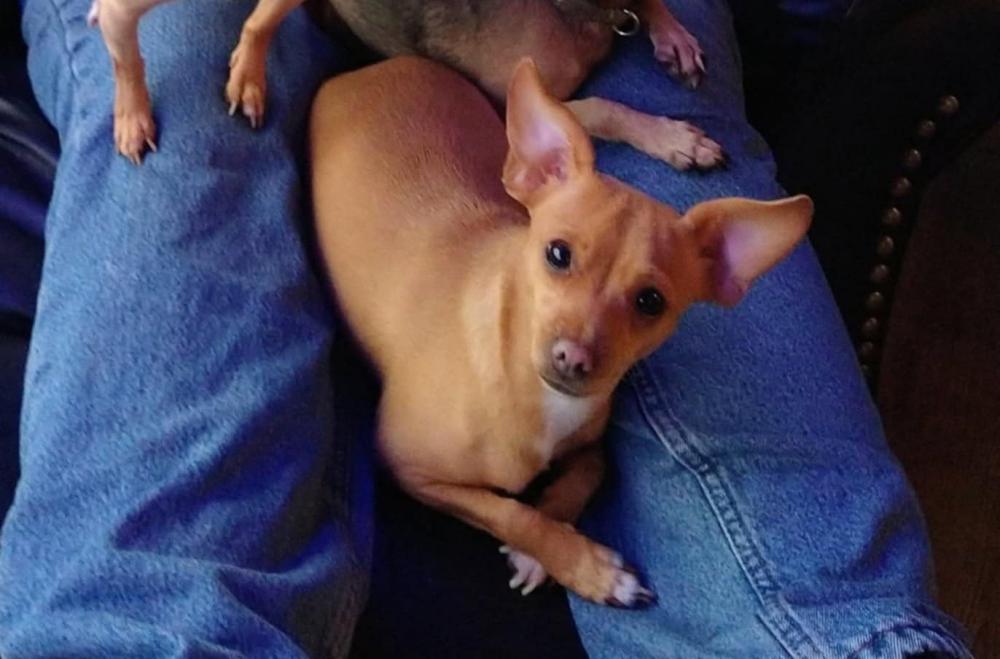 Pet Description:Half chihuahua half min pin. About eight pounds and has socked feet and big ears. |
