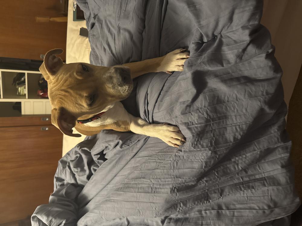 Pet Description:Mixed pit female puppy. Very friendly. Golden body with white paws, chest and tip of tail. Found with red collar. |