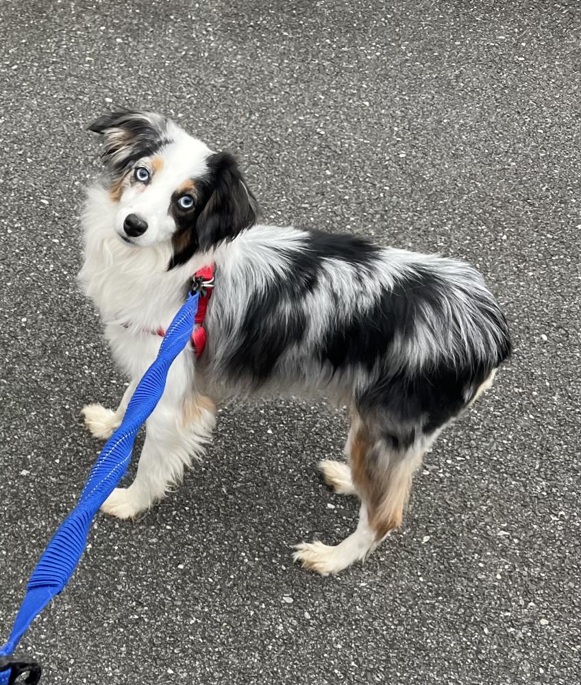 Pet Description:Miniature Aussie with a red harness. His name is Finn. He’s shy and skittish. No rags, but he has a chip. |