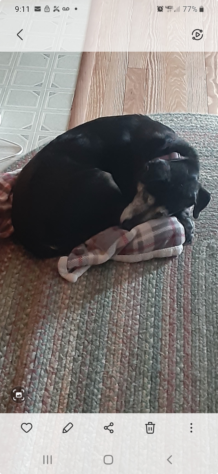 Pet Description:All black with white muzzle. Lab mix. Going blind and slightly deaf. Has been acting restless and is having hip issues. She usually follows me everywhere. |