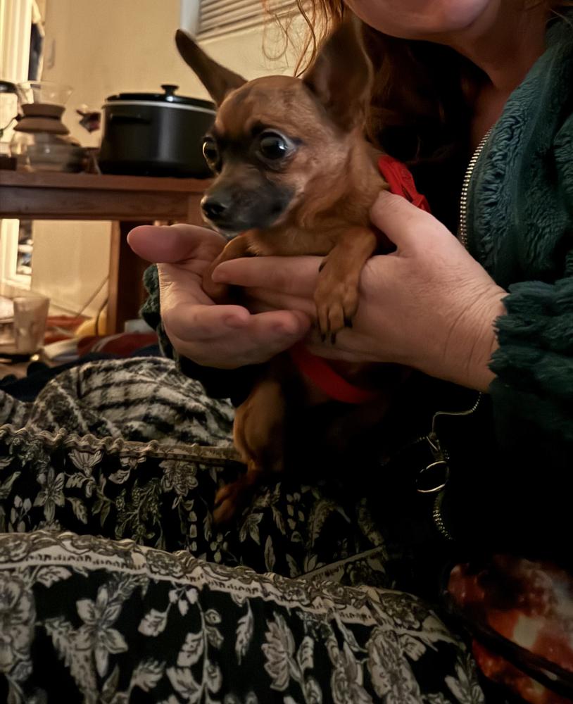 Pet Description:This tiny little chihuahua hopped into my car when I parked to go to my sisters house for a small get together. She is very sweet and snuggled in my jacket during the entire event. I brought her home with me and she seemed very hungry and ate two bowls of food and then slept all night on a throw pillow. She is currently snoring. If she doesn't have someone worried about her I will keep her. |