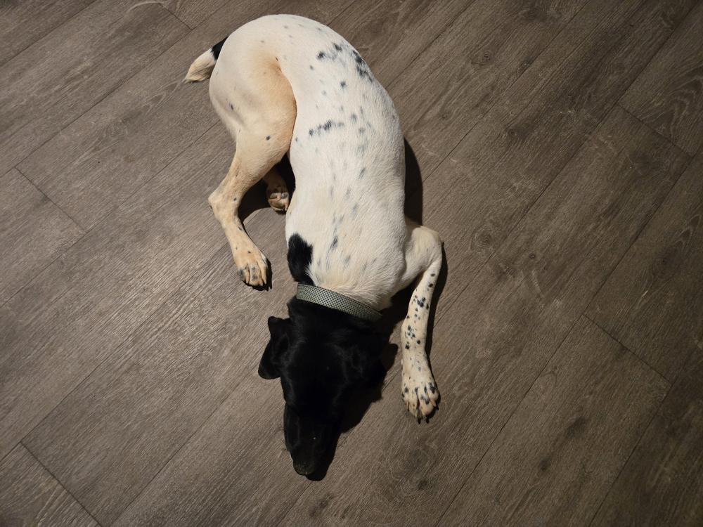 Pet Description:GSP with solid black head and mostly white body with some black throughout and black spots. Wearing a black and blue collar. |