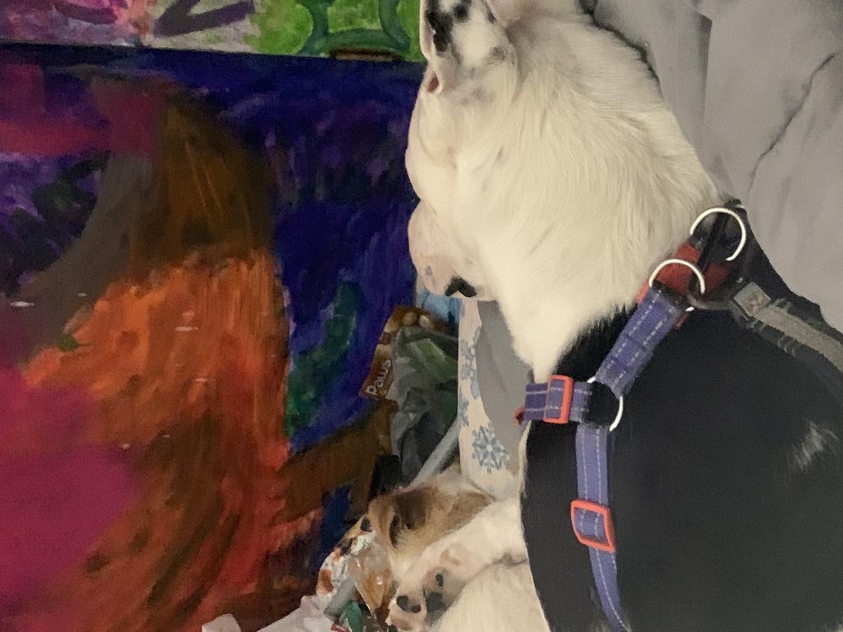 Pet Description:Black and brown German shepherd female with a pink harness and should be traveling with her baby daddy a white and black Great Dane mastiff with a blue harness that has a grey handle on it |
