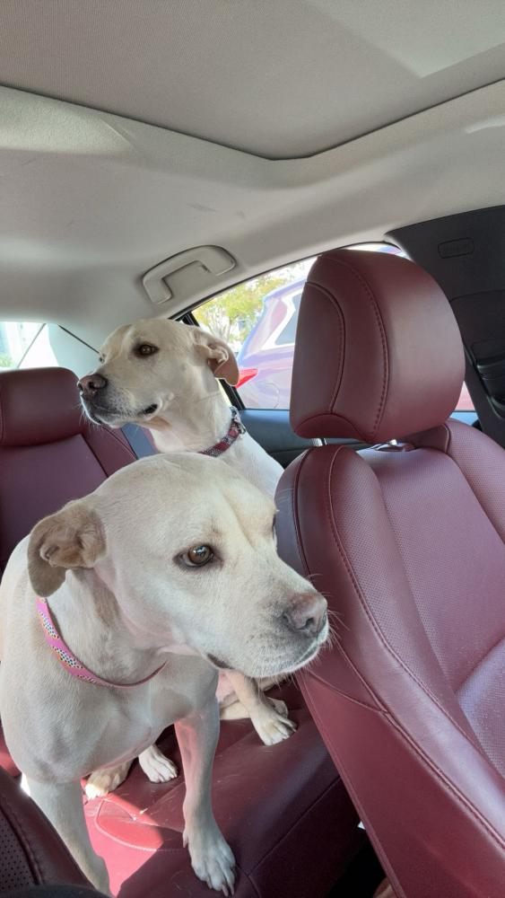 Pet Description:One dog is a smaller and female and is a pitbull lab, the other is an older Male Lab. They have pink and red colors |