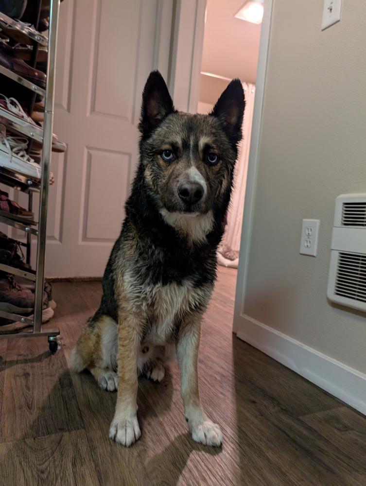 Pet Description:Small(ish) German Shepherds and maybe Husky mix (bright blue eyes) Lots of love, gets excitable around other dogs but not aggressive at all. |