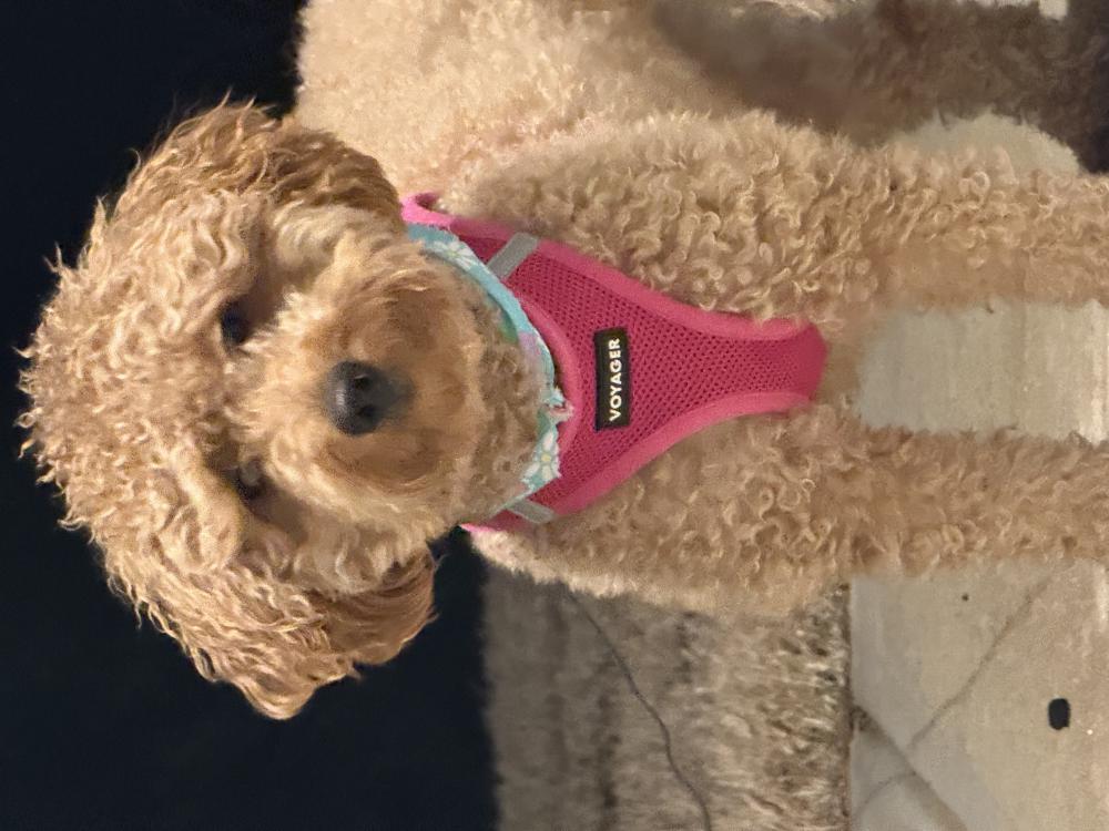 Pet Description:Mini golden doodle with brown curly hair |