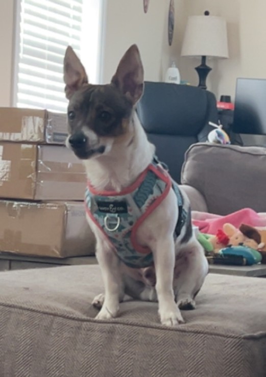 Pet Description:Hank is brown and white. He is a small dog around 9 months old. Wearing a green and white dinosaur harness with pink trim. |