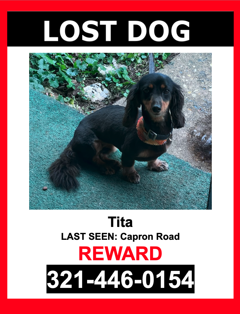 Pet Description:**MISSING SINCE 3/15/2025 AT 4:00 PM**Tita is a female, black & brown, dachshund who escaped and was last seen near Kanawha St & Capron Rd. Tita is wearing her multi-colored collar and IS not microchipped. If you see Tita please DO NOT CHASE HER.PLEASE CALL OR TEXT ONLY.321-446-0154$$ Reward $$ |