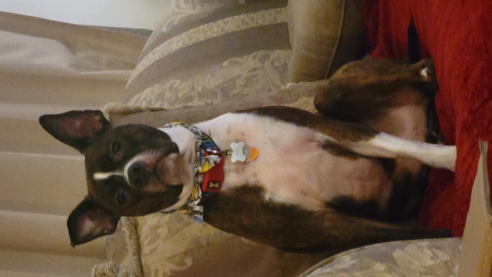 Pet Description:Brown/Black Boxer mix with white belly and white around nose. Collar with rainbow color and bones. Well trained, but is scared and disoriented because of a bad seizure yesterday. |