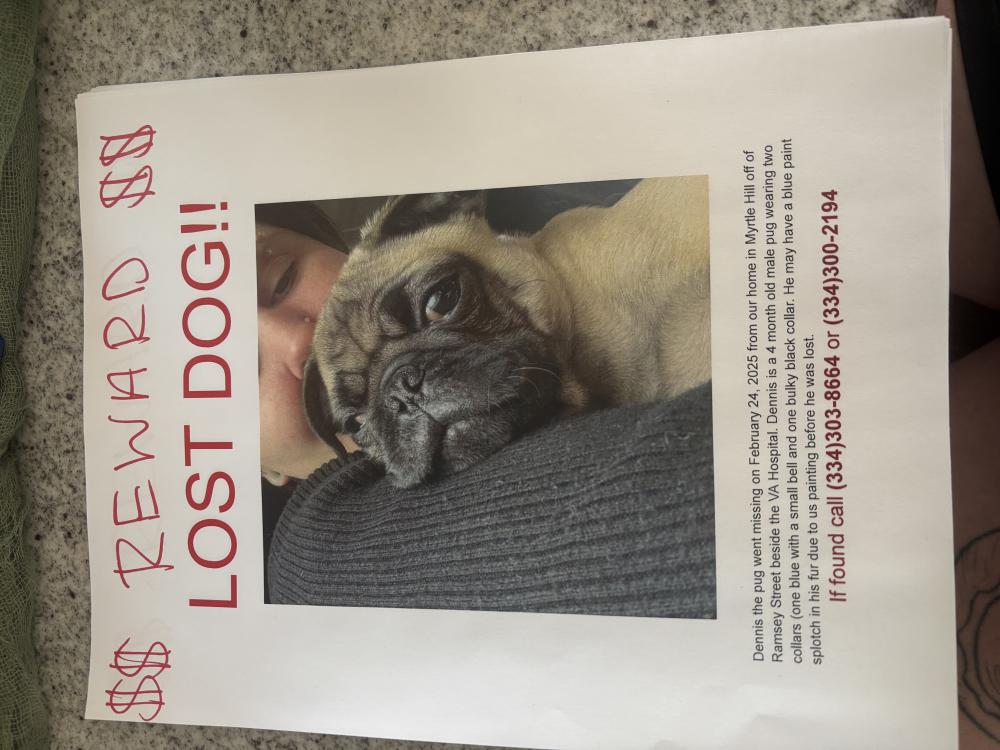 Pet Description:5-6 months old brownish tan with black face and spot on tail. Was wearing blue collar with bell and black training collar. Goes by Dennis. Intact male puppy |