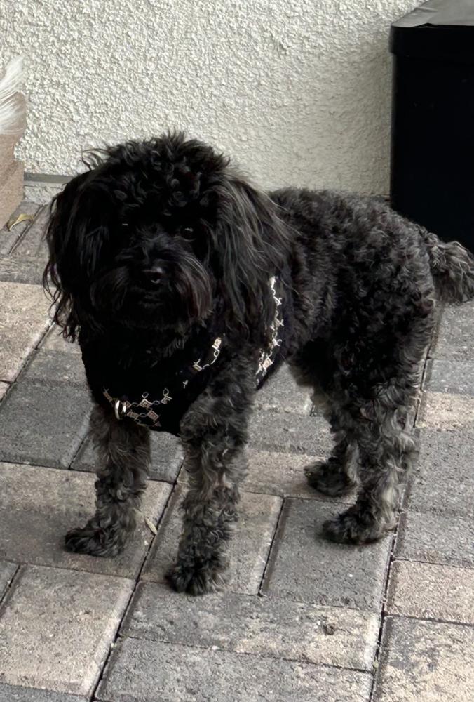 Pet Description:Poodle mix , 6 pounds , spayed , all black color , over bite lower bottom teeth . |