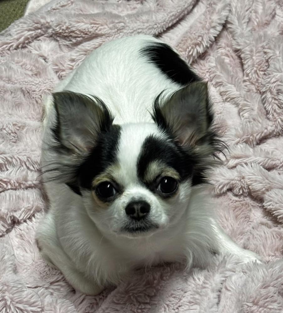 Pet Description:Apple head Long Hair Chihuahua about 1 year old Black and white Mainly white Just black ears and spot on tail and near bottom area. |