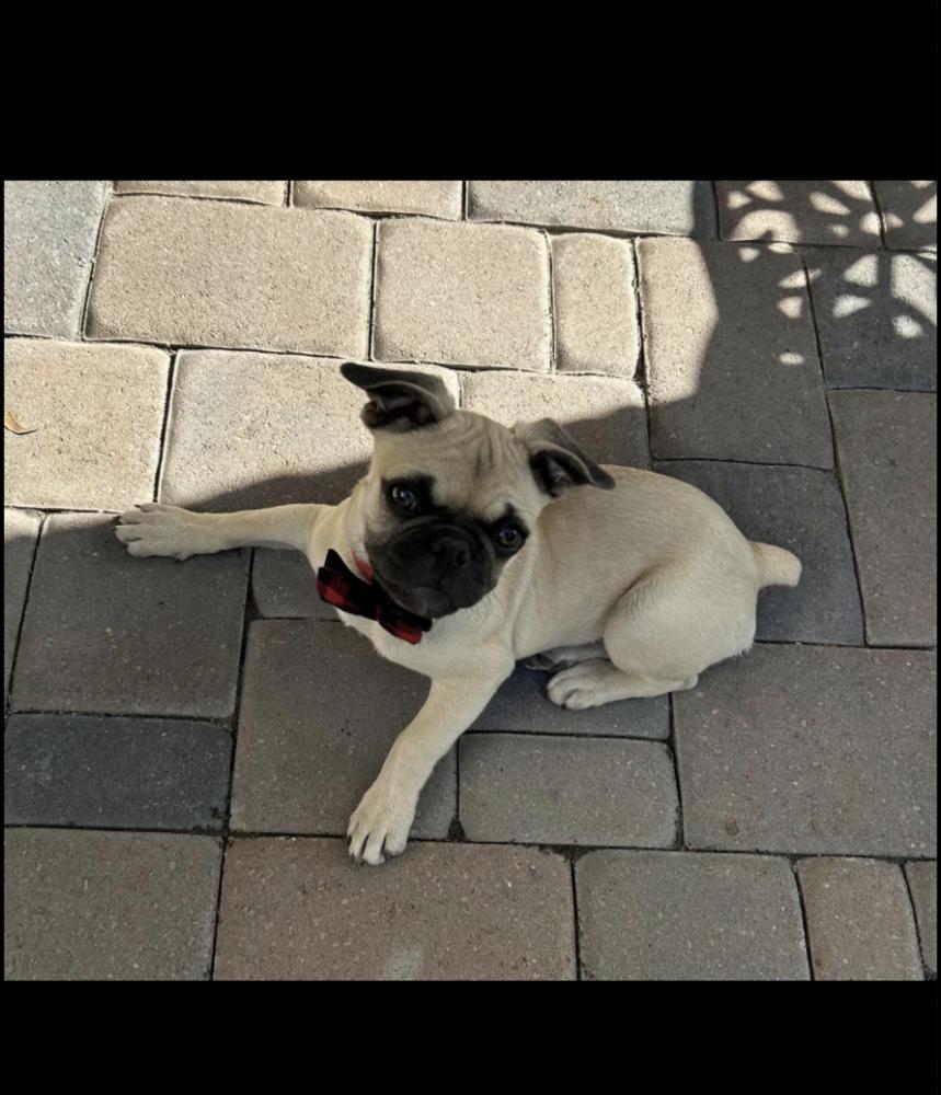 Pet Description:Tan pug frenchie mix, black face, short tail, very small, wearing bow tie collar when he was lost |