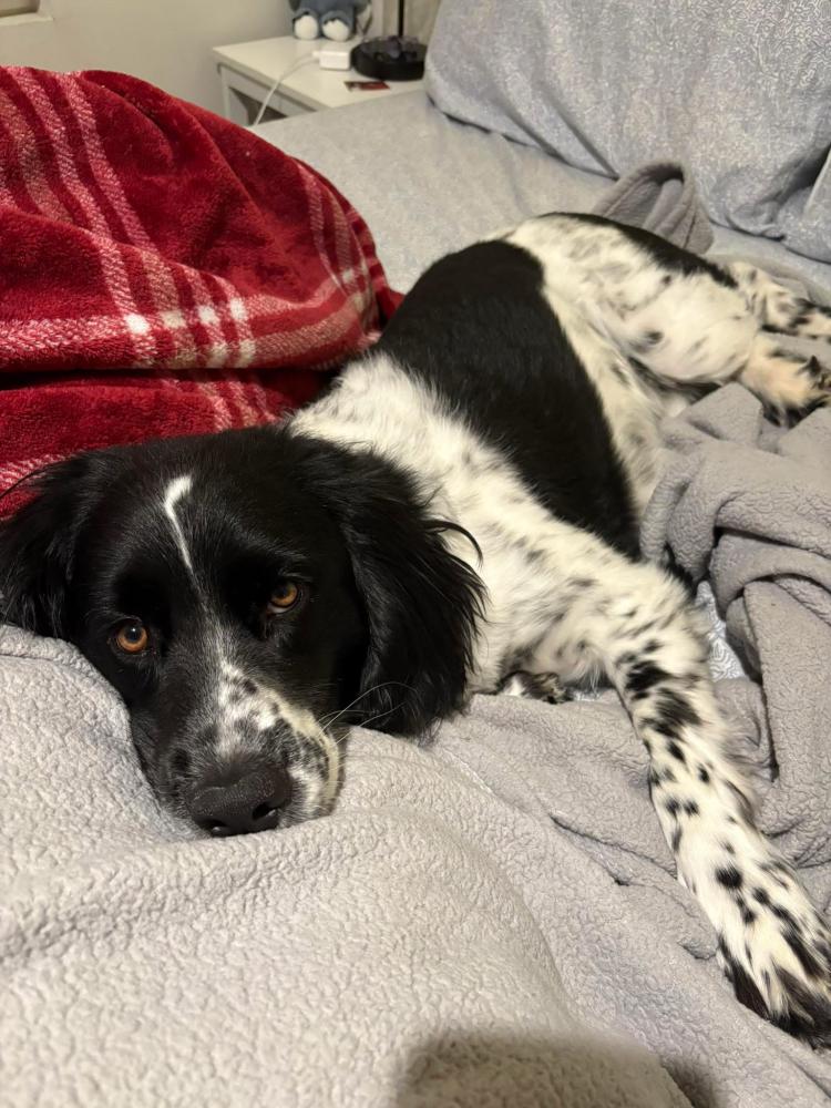 Pet Description:Black and White with spots. Medium Size Dog with big paws. Wearing a Harness and probably leash still on him |