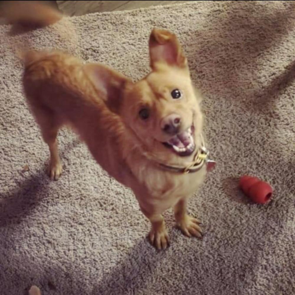Pet Description:Small/medium sized, long haired golden coat, chihuahua mix, tail that curls up onto back, tip of one ear folds down. |