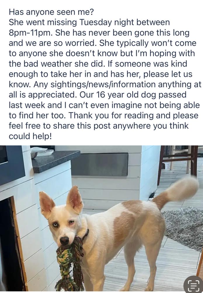 Pet Description:Husky and cattle dog mix she is white with brown spots has a ring around her right eye. Her hair is smooth and weighs about 47 pounds. |