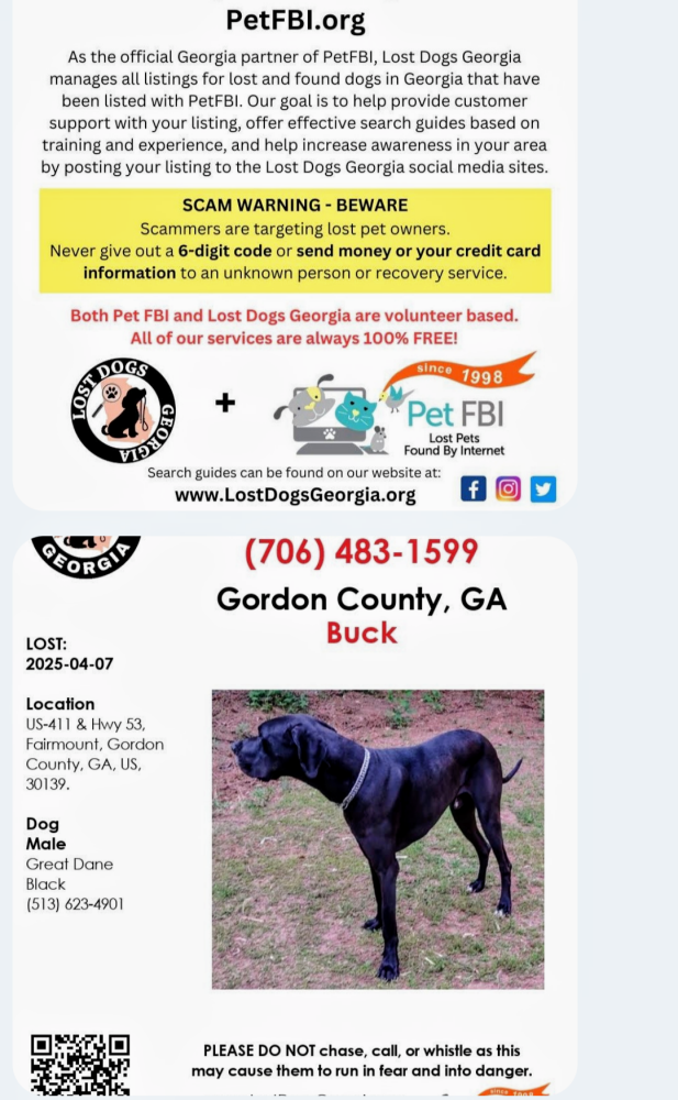 Pet Description:ALERT:UPDATE STILL MISSING DOG Friday 11th black Great Dane. Ryo mountain area he went out early early Monday morning to go potty and ran after something I still can't find him if you see him please ?? message me please ??or call 706-483-1599. UPDATE STILL NOT HOME today Wednesday the 9th ?? please ?? if you see him or if anyone has found him please please ?? send him home send him home with his family the other pups are sad and confused not wanting to eat we are hurting very much please 706-48 |